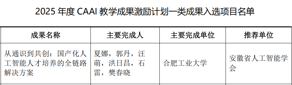 近日,中国人工智能学会(CAAI)正式公示2025年度CAAI激励计划入选项目名单,由夏娜教授牵头,郭丹、汪萌教授等共同完成的“从通识到共创:国产化人工智能人才培养的全链路解决方案”项目,成功入选教学成果激励计划一类成果,彰显了点点官网在人工智能人才培养领域的深厚积淀与创新实力。